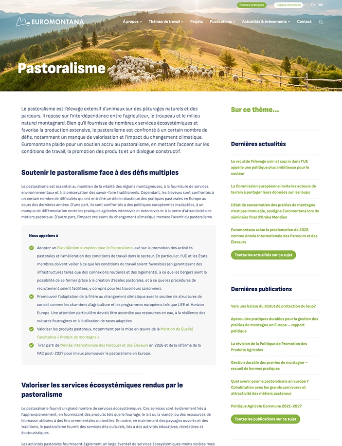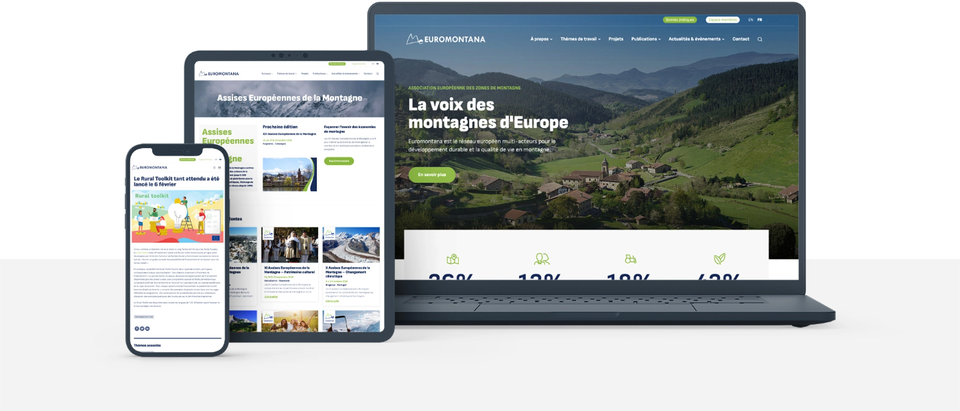 Datant de 2014, le précédent site internet d’Euromontana avait besoin d’une refonte graphique et fonctionnelle. Après consultation et en cohérence avec ses valeurs, Euromonatana a sélectionné Très Bien, agence implantée dans une zone de montagne, pour assurer la refonte de son site internet sous WordPress.