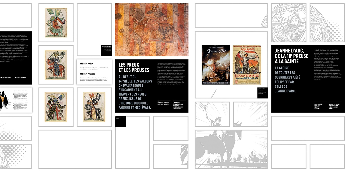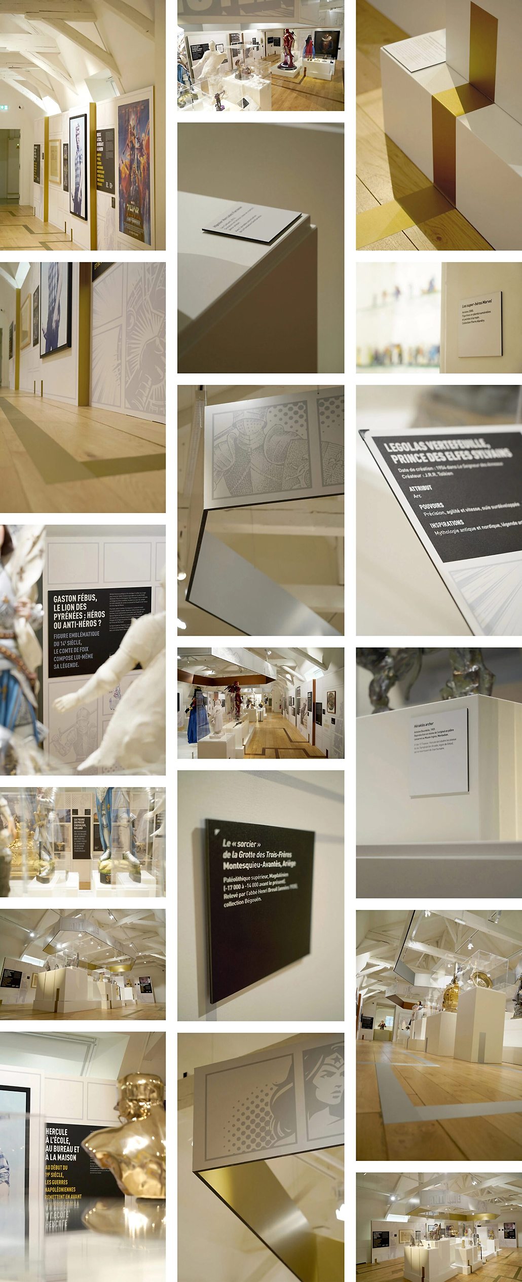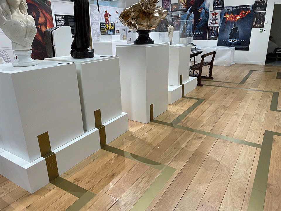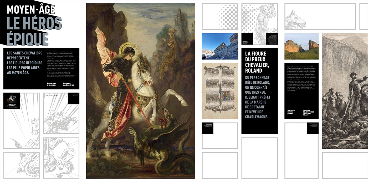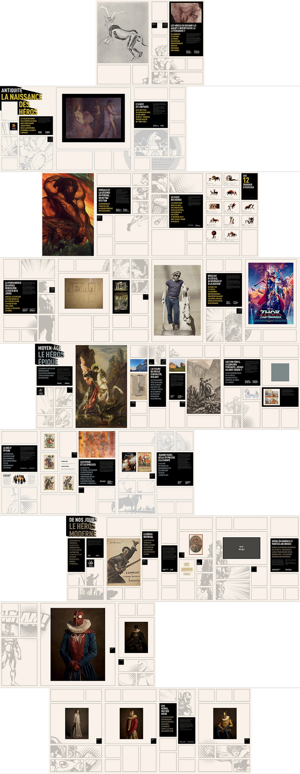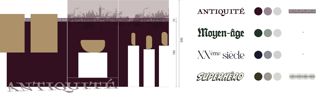 À partir de ces éléments, nous avons proposé une première piste d’habillage des fonds de cimaises en juxtaposant, sous forme de collages, différents éléments graphiques. Chaque époque disposait ainsi de son illustration, mêlant les figures héroïques mythiques et les super-héros.