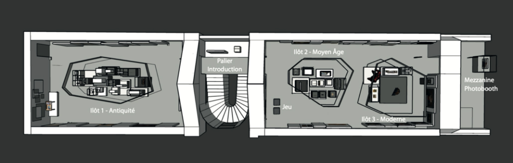 Au vu du grand nombre d’œuvres à mettre en scène, les premières esquisses de la scénographie proposaient une circulation guidée à travers les époques avec une collection répartie de part de d’autres d’un couloir de visite. Chaque époque disposait ainsi de son espace permettant d’exposer les œuvres classiques associées à leurs pendants modernes.
